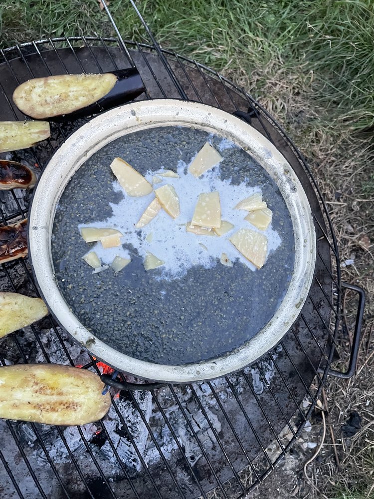 Zwiebeln und Knoblauch in 1 EL Butter andünsten und dann mit Weisswein/Apfelsaft ablöschen, Bouillon und Lorbeerblatt beifügen und aufkochen. Polenta und Bio-Pflanzenkohle langsam unter ständigem Rühren beifügen. Anschliessend zugedeckt, bei kleiner Hitze 20-25 Min. köcheln lassen. Regelmässig umrühren. Danach Rahm, Sprinz und Peperoncini beifügen, abschmecken und nochmal erhitzen. Am Schluss 2 EL Butter unterrühren und Polenta zähflüssig auf eine Platte oder ein grosses Brett giessen. Kann nach kurzer Zeit in Streifen geschnitten werden. Die Sprinzstücke sollten noch nicht ganz gsschmolzen sein.